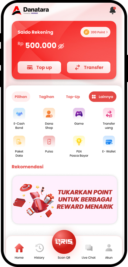 Danatara dirancang untuk mempermudah aktivitas finansial harian Anda melalui satu platform digital yang terintegrasi. Pengguna dapat melakukan berbagai transaksi produk digital, mengelola poin, hingga mengakses layanan pendanaan dengan proses yang jelas dan mudah dipahami. Semua fitur tersedia dalam satu aplikasi untuk memberikan pengalaman yang praktis dan efisien.